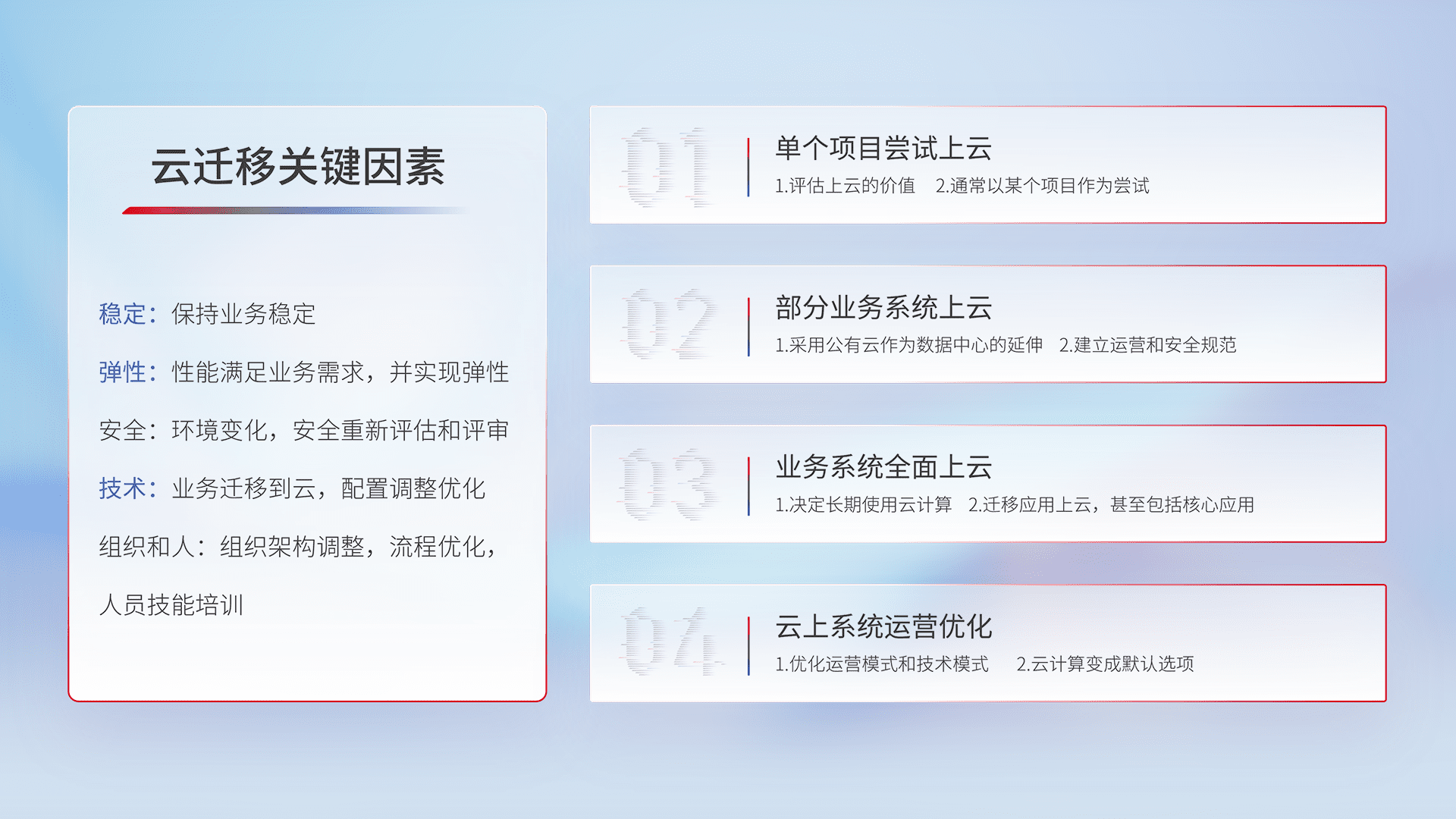 结合实际业务,,从规划设计、、、、云平台选型、、、云原生改造、、数据迁移、、、、集成交付,,,,迁移全过程为客户识别最佳上云路径,,,,做好风险识别管理,,,设计网络架构、、、身份权限、、、、安全审计合规、、操作审计、、日志审计、、、、监控告警策略、、、、多站点容灾设计等,,,对云上基础设施进行整体规划,,,,提升IT治理水平,,,,以满足弹性、、高可用、、、、高性能的需求。。